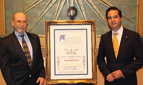 The Adam Smith Award is the highest honor bestowed by The Association of Private Enterprise Education (APEE). It is given to recognize an individual who has made a sustained and lasting contribution to the perpetuation of the ideals of a free market economy as first laid out in An Inquiry into the Nature and Causes of The Wealth of Nations (1776). The recipient of this award must be an individual who has acquired an international reputation as an eloquent scholar and advocate of free enterprise and the system of entrepreneurship which underlies it. In searching for a recipient, APEE looks for someone who through their writing, speaking, and professional life, has focused attention upon the fundamental principles which are the bulwark of our organization.